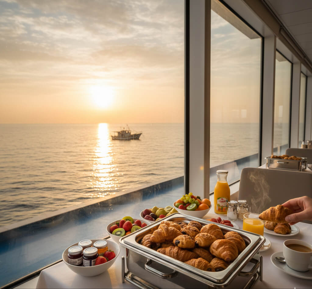 Le cadre ajoute une dimension unique à ce moment privilégié. Installé confortablement dans le restaurant ou l'un des salons panoramiques du navire, vous pourrez savourer votre repas tout en admirant le lever du soleil sur l'horizon, le spectacle apaisant des vagues ou les premières lueurs sur les côtes. C'est l'occasion idéale de se détendre et de se préparer à une journée de voyage, de découverte ou de retour à la maison.
